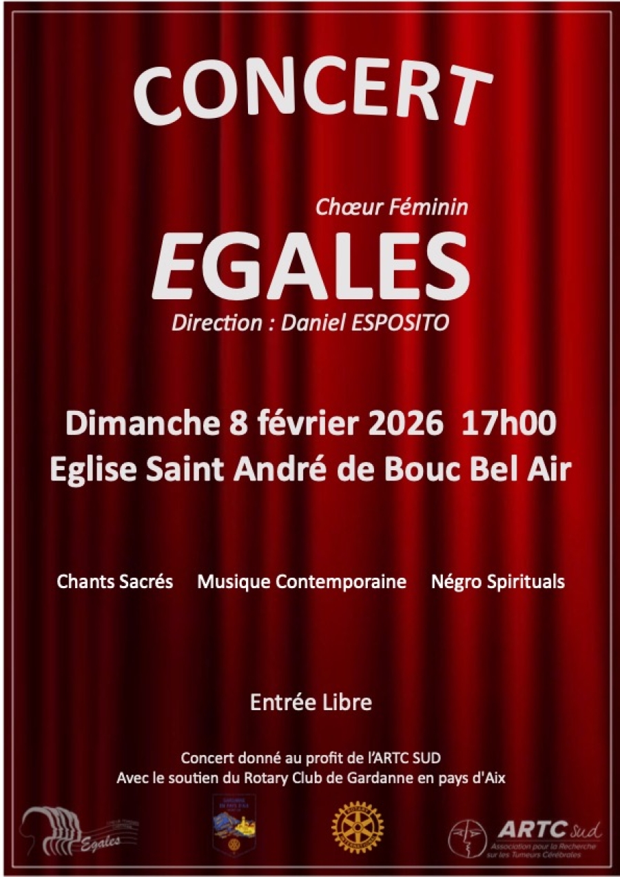 Nous vous invitons à venir nombreux assister au concert du choeur féminin Egales qui aura lieu le 8 février à 17h à L'Eglise Saint André de bouc Bel Air